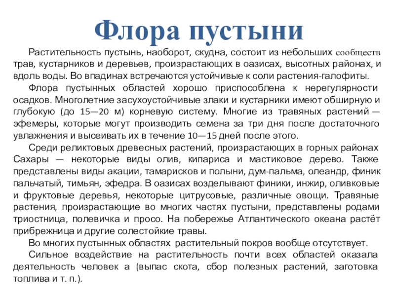 Слайд 20Растительность пустынь, наоборот, скудна, состоит из небольших сообществ трав, кустарников и