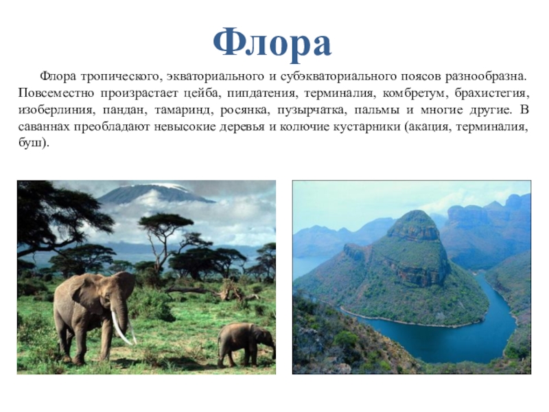 Слайд 18Флора тропического, экваториального и субэкваториального поясов разнообразна. Повсеместно произрастает цейба, пипдатения,