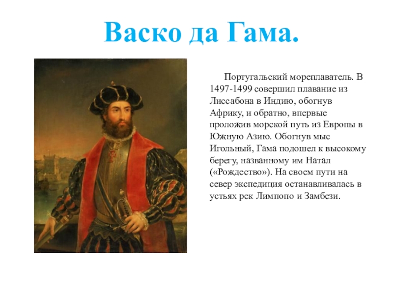 Индию, обогнув Африку, и обратно, впервые проложив морской путь из Европы в Южную Азию. Обогнув мыс Игольный, Гама подошел к высокому берегу, названному им Натал («Рождество»). На своем пути на север экспедиция останавливалась в устьях рек Лимпопо и Замбези.