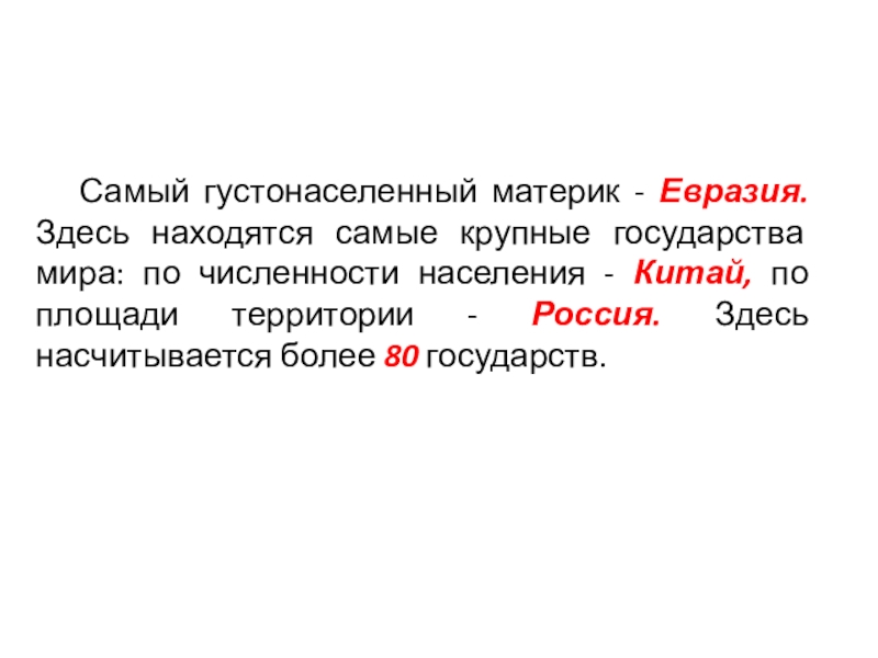 Слайд 2Самый густонаселенный материк - Евразия. Здесь находятся самые крупные государства мира: