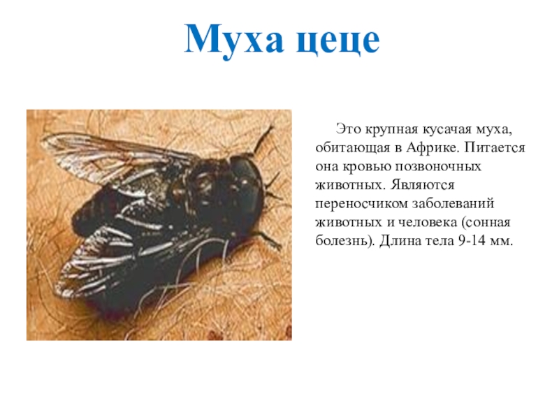 Это крупная кусачая муха, обитающая в Африке. Питается она кровью