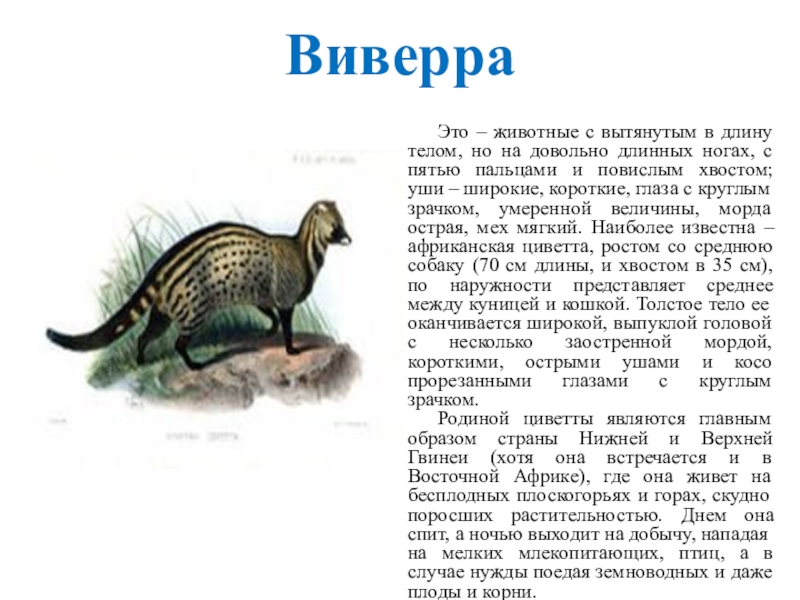 длинных ногах, с пятью пальцами и повислым хвостом; уши – широкие, короткие, глаза с круглым зрачком, умеренной величины, морда острая, мех мягкий. Наиболее известна – африканская циветта, ростом со среднюю собаку (70 см длины, и хвостом в 35 см), по наружности представляет среднее между куницей и кошкой. Толстое тело ее оканчивается широкой, выпуклой головой с несколько заостренной мордой, короткими, острыми ушами и косо прорезанными глазами с круглым зрачком.