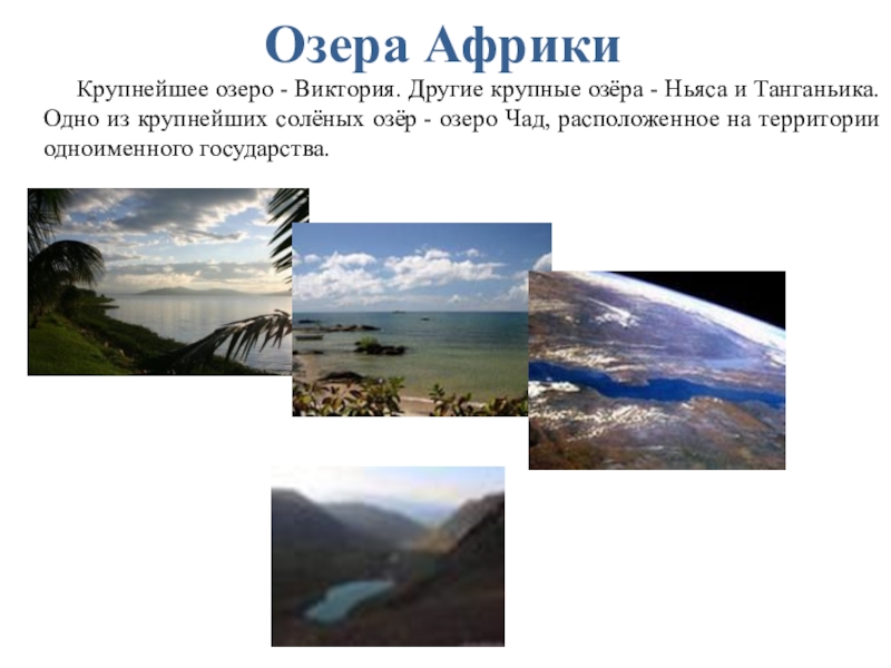 Крупнейшее озеро - Виктория. Другие крупные озёра - Ньяса и Танганьика. Одно