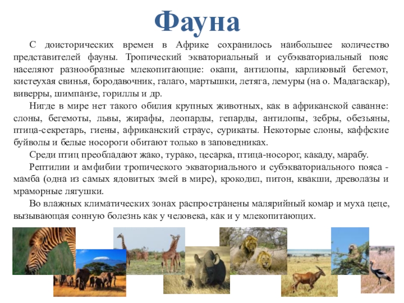 Слайд 23С доисторических времен в Африке сохранилось наибольшее количество представителей фауны. Тропический