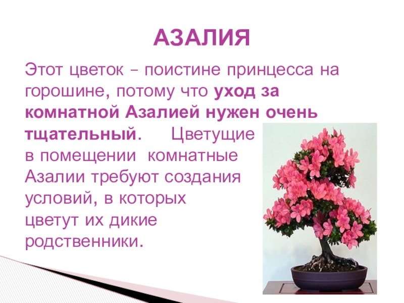 АЗАЛИЯЭтот цветок – поистине принцесса на горошине, потому что уход за комнатной Азалией нужен очень тщательный.
