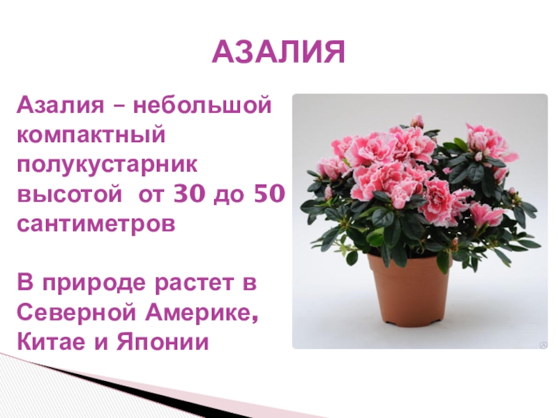 АЗАЛИЯАзалия – небольшой компактный полукустарник высотой от 30 до 50 сантиметровВ природе растет в Северной Америке, Китае
