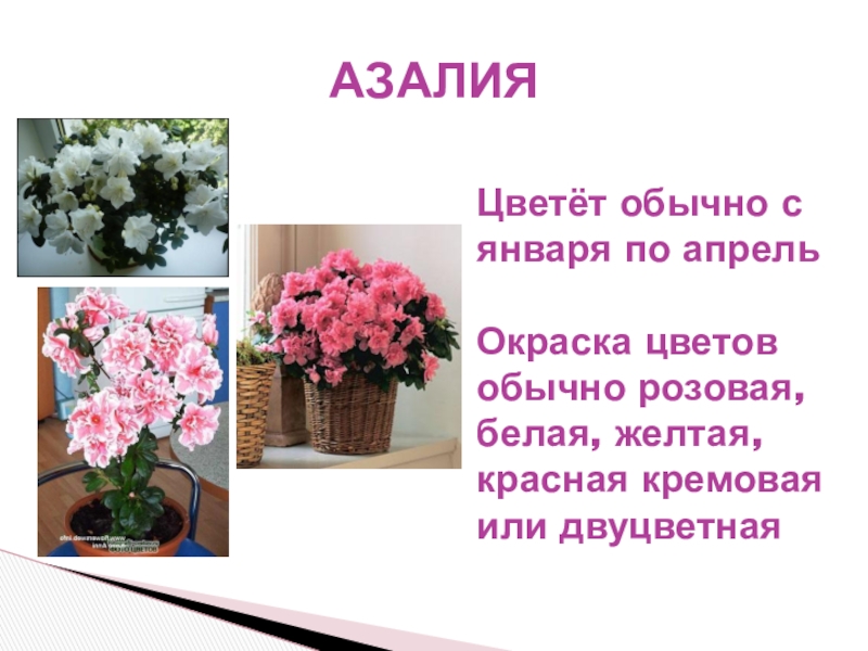 АЗАЛИЯЦветёт обычно с января по апрельОкраска цветов обычно розовая, белая, желтая, красная кремовая или двуцветная
