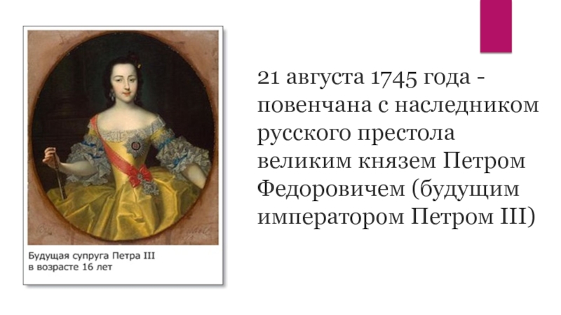 21 августа 1745 года - повенчана с наследником русского престола великим князем Петром Федоровичем (будущим императором Петром