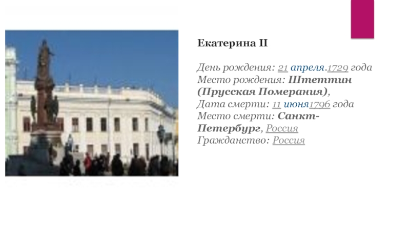 Екатерина II День рождения: 21 апреля.1729 года Место рождения: Штеттин (Прусская Померания),   Дата смерти: 11 июня1796 года Место смерти: Санкт-Петербург, Россия Гражданство: Россия