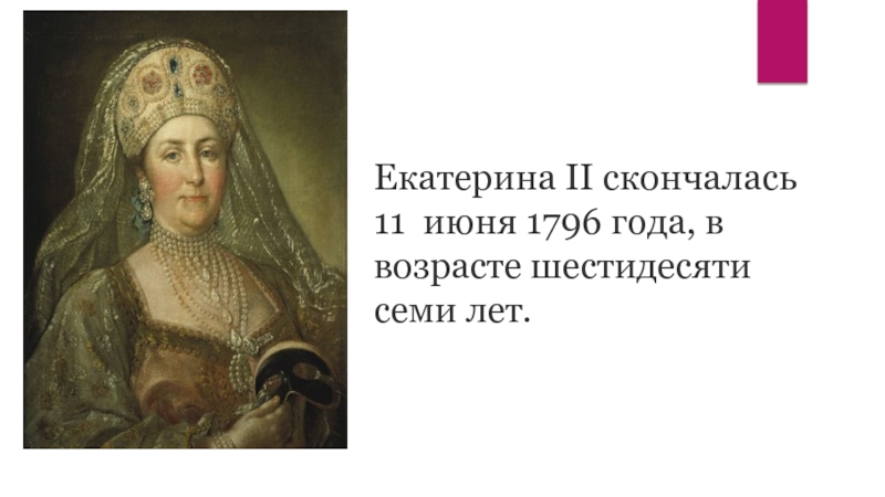 Слайд 6Екатерина II скончалась 11 июня 1796 года, в возрасте шестидесяти семи