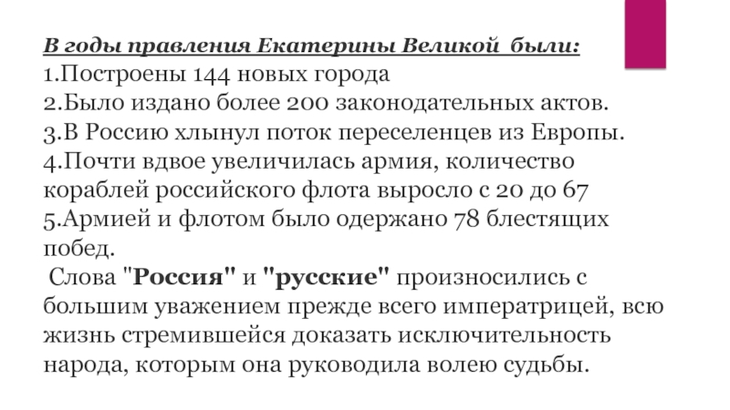 1.Построены 144 новых города 2.Было издано более 200 законодательных актов. 3.В Россию хлынул поток переселенцев из Европы. 4.Почти вдвое увеличилась армия, количество кораблей российского флота выросло с 20 до 67 5.Армией и флотом было одержано 78 блестящих побед.
