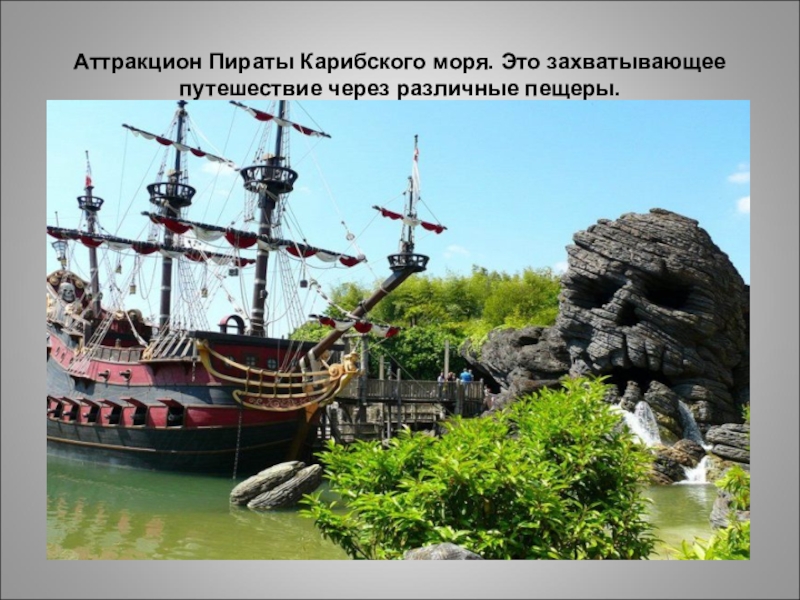 Слайд 31Аттракцион Пираты Карибского моря. Это захватывающее путешествие через различные пещеры.