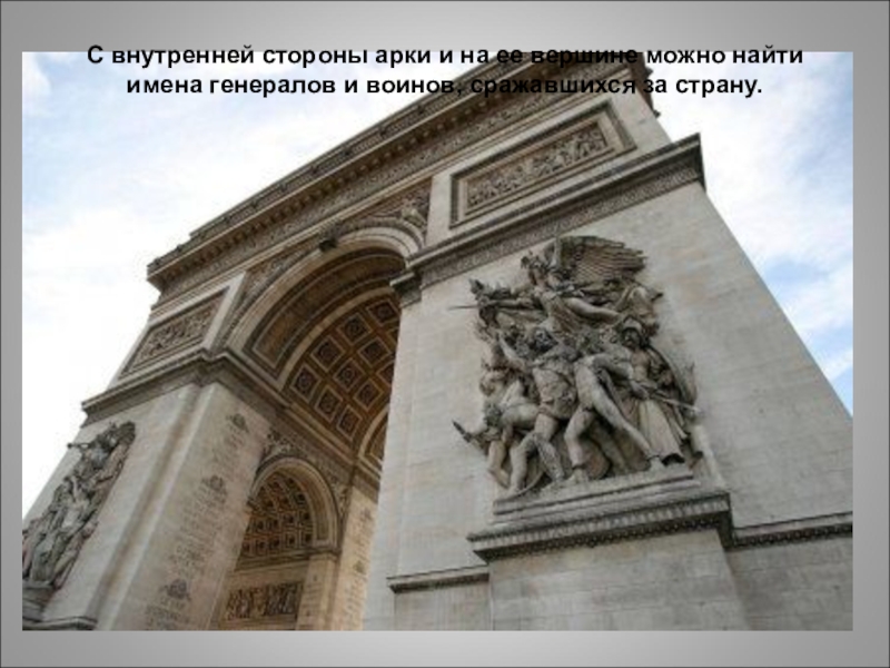 Слайд 23С внутренней стороны арки и на ее вершине можно найти имена