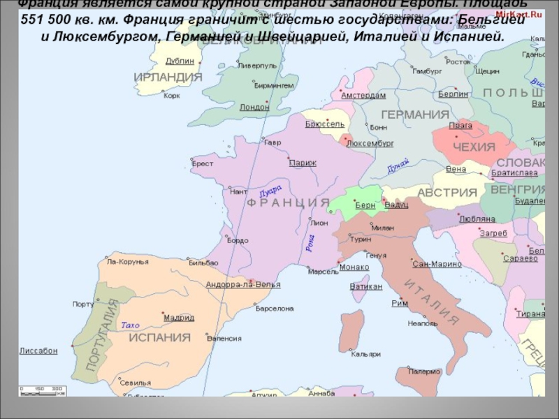 км. Франция граничит с шестью государствами: Бельгией и Люксембургом, Германией и Швейцарией, Италией и Испанией.