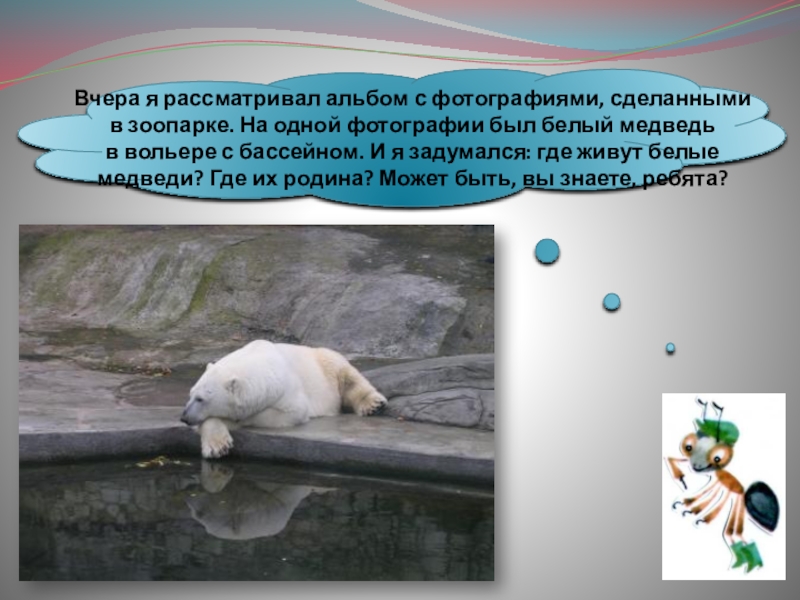 Слайд 5Вчера я рассматривал альбом с фотографиями, сделанными в зоопарке. На одной фотографии был белый медведь