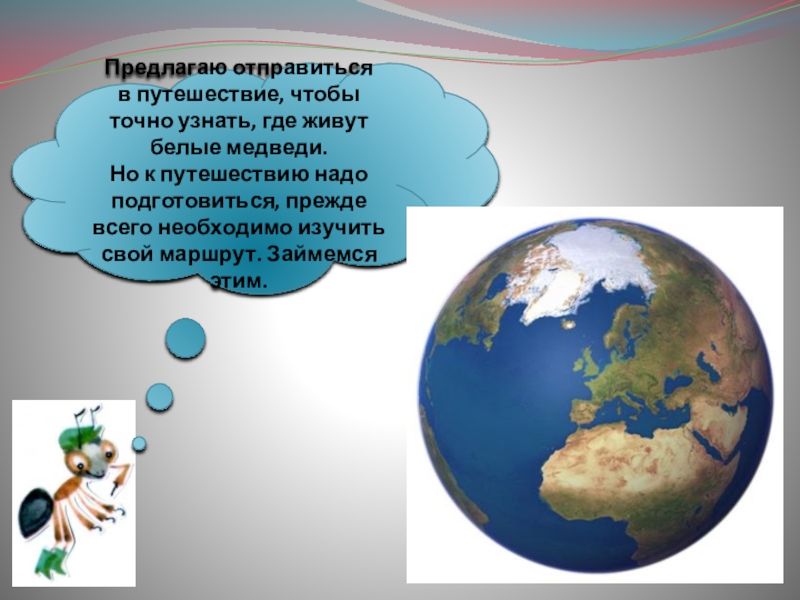Слайд 6Предлагаю отправиться в путешествие, чтобы точно узнать, где живут белые медведи. Но к путешествию