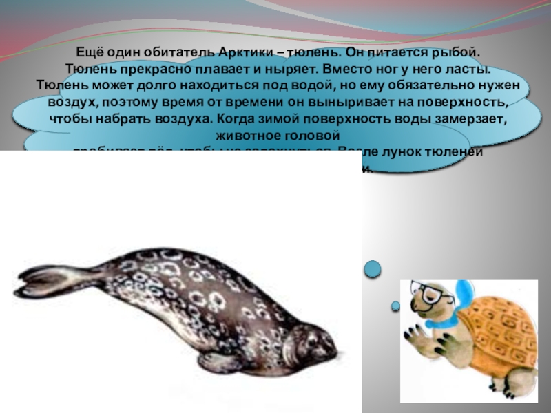 Слайд 19Ещё один обитатель Арктики – тюлень. Он питается рыбой.