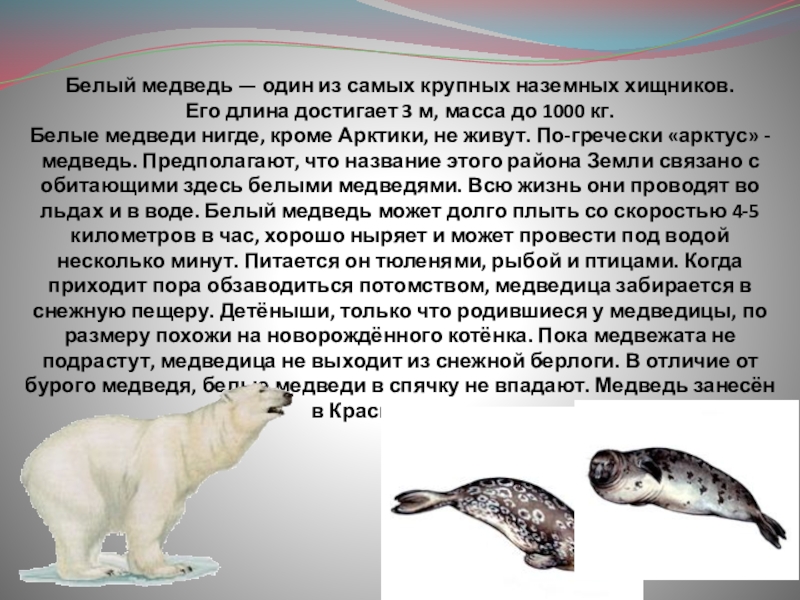 Белые медведи нигде, кроме Арктики, не живут. По-гречески «арктус» - медведь. Предполагают, что название этого района Земли связано с обитающими здесь белыми медведями. Всю жизнь они проводят во льдах и в воде. Белый медведь может долго плыть со скоростью 4-5 километров в час, хорошо ныряет и может провести под водой несколько минут. Питается он тюленями, рыбой и птицами. Когда приходит пора обзаводиться потомством, медведица забирается в снежную пещеру. Детёныши, только что родившиеся у медведицы, по размеру похожи на новорождённого котёнка. Пока медвежата не подрастут, медведица не выходит из снежной берлоги. В отличие от бурого медведя, белые медведи в спячку не впадают. Медведь занесён в Красную книгу.