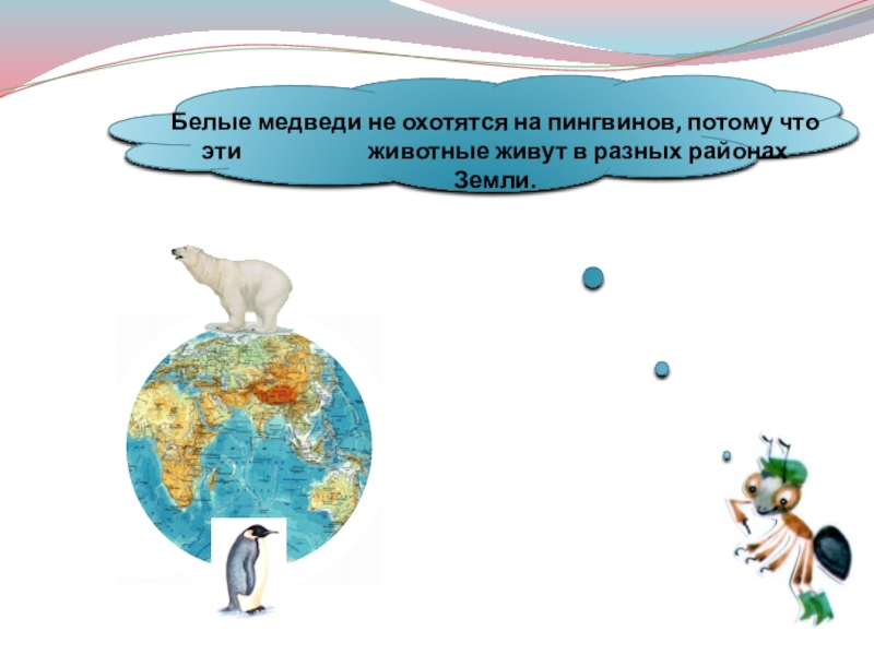 Слайд 35Белые медведи не охотятся на пингвинов, потому что эти