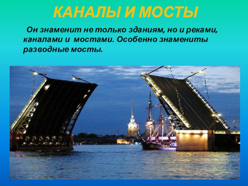 КАНАЛЫ И МОСТЫ	Он знаменит не только зданиям, но и реками, каналами и мостами. Особенно знамениты разводные мосты.