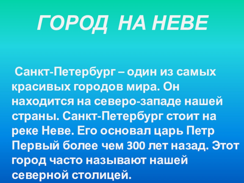 ГОРОД НА НЕВЕ Санкт-Петербург – один из самых красивых городов мира. Он находится на северо-западе нашей страны. Санкт-Петербург стоит на реке Неве. Его основал царь Петр Первый более чем 300 лет назад. Этот город часто называют нашей