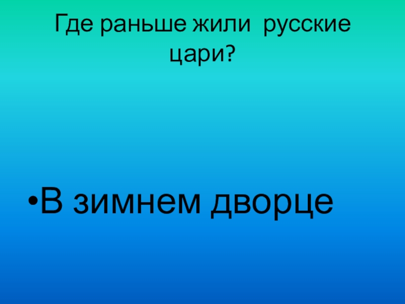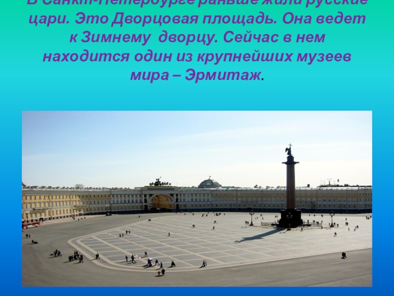 Слайд 7В Санкт-Петербурге раньше жили русские цари. Это Дворцовая площадь. Она ведет