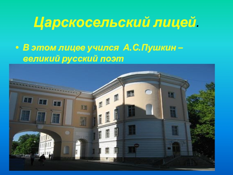Царскосельский лицей.В этом лицее учился А.С.Пушкин – великий русский поэт
