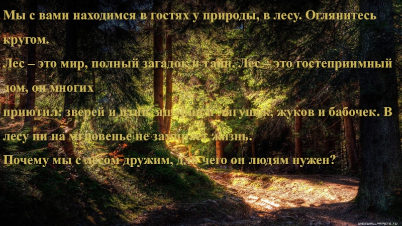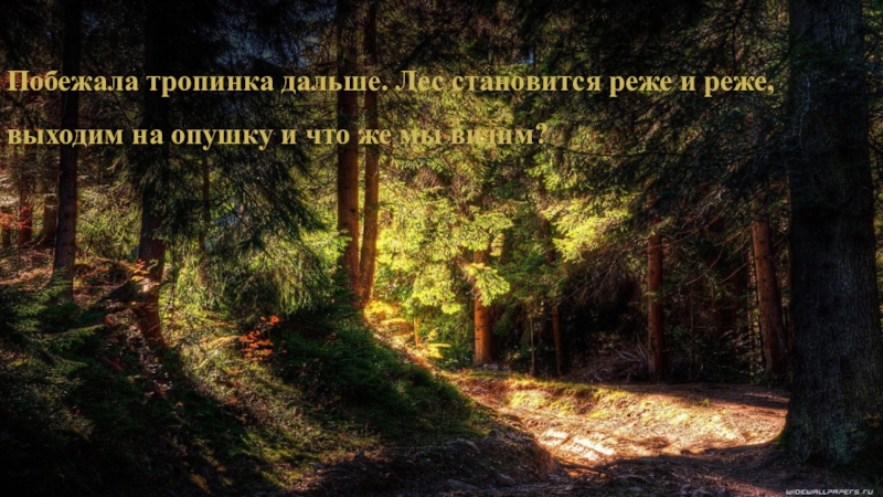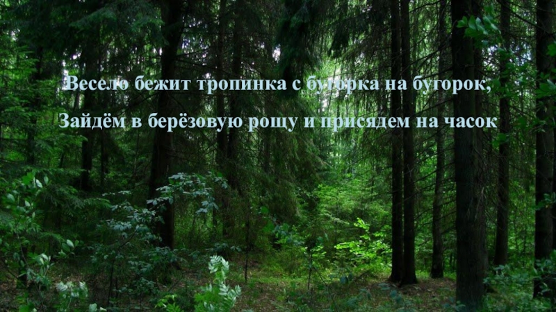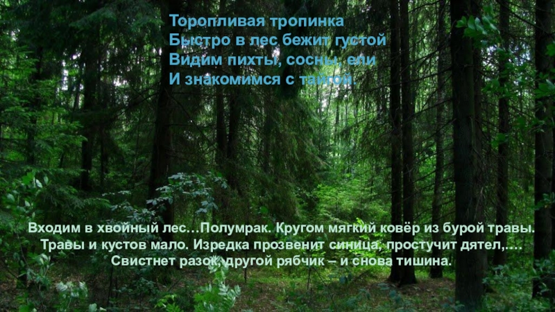 Входим в хвойный лес…Полумрак. Кругом мягкий ковёр из бурой травы. Травы и кустов мало. Изредка прозвенит синица, простучит дятел,…. Свистнет разок, другой рябчик – и снова тишина.