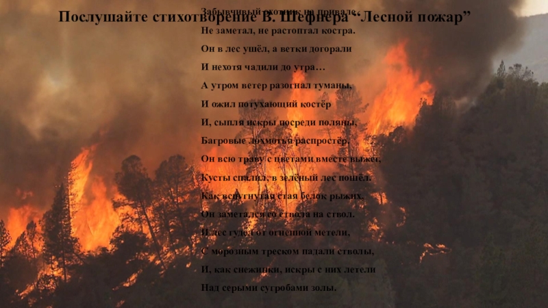 Брошенная горящая спичка, окурок, незатушенный костёр, осколок стекла, брошенный на солнечном месте. Всё это может стать причиной лесного пожара.