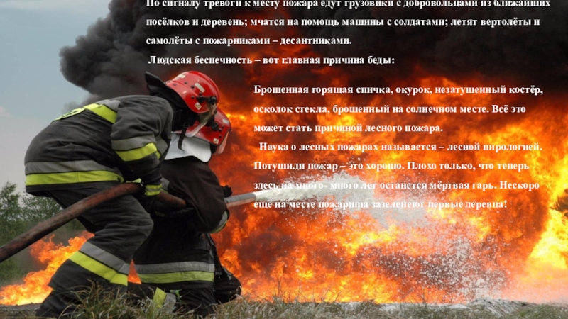 Наука о лесных пожарах называется – лесной пирологией. Потушили пожар – это хорошо. Плохо только, что теперь здесь на много- много лет останется мёртвая гарь. Нескоро ещё на месте пожарища зазеленеют первые деревца!
