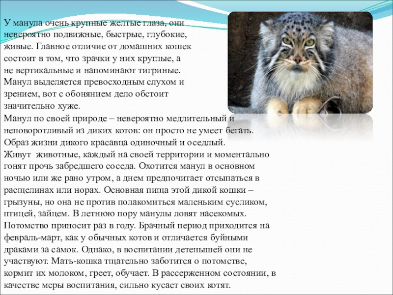 Манул по своей природе – невероятно медлительный и неповоротливый из диких котов: он просто не умеет бегать. Образ жизни дикого красавца одиночный и оседлый. Живут животные, каждый на своей территории и моментально гонят прочь забредшего соседа. Охотится манул в основном ночью или же рано утром, а днем предпочитает отсыпаться в расщелинах или норах. Основная пища этой дикой кошки – грызуны, но она не против полакомиться маленьким сусликом, птицей, зайцем. В летнюю пору манулы ловят насекомых.