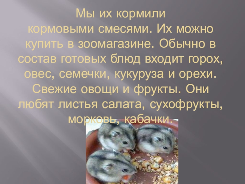 Слайд 7 Мы их кормили кормовыми смесями. Их можно купить в зоомагазине. Обычно