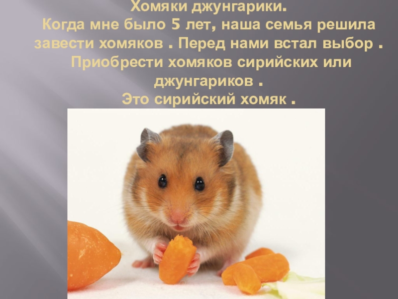 Хомяки джунгарики. Когда мне было 5 лет, наша семья решила завести хомяков . Перед нами встал выбор . Приобрести хомяков сирийских или джунгариков . Это сирийский хомяк .