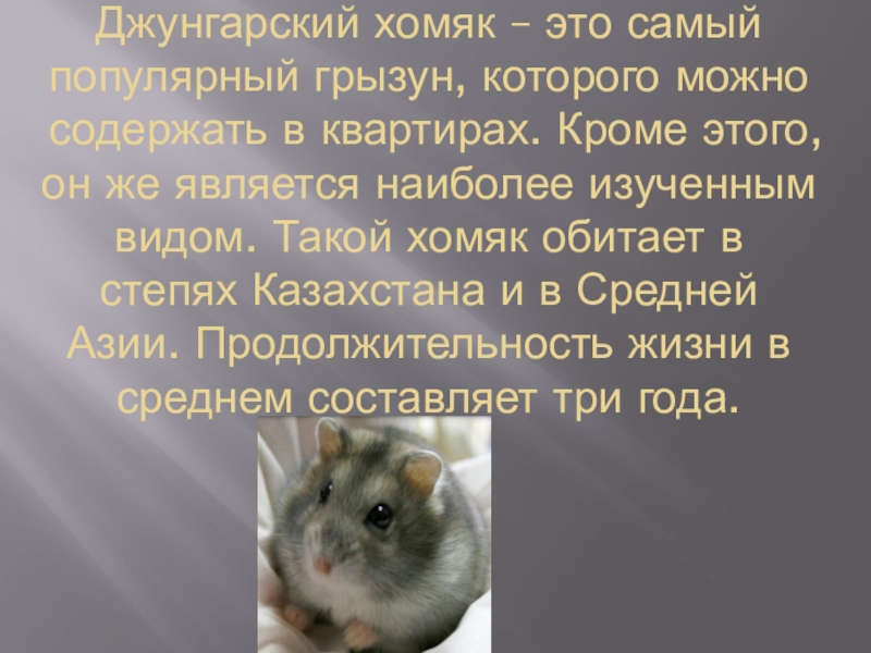 квартирах. Кроме этого, он же является наиболее изученным видом. Такой хомяк обитает в степях Казахстана и в Средней Азии. Продолжительность жизни в среднем составляет три года.