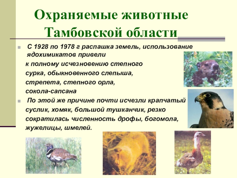 Охраняемые животные    Тамбовской областиС 1928 по 1978 г распашка земель, использование ядохимикатов привели