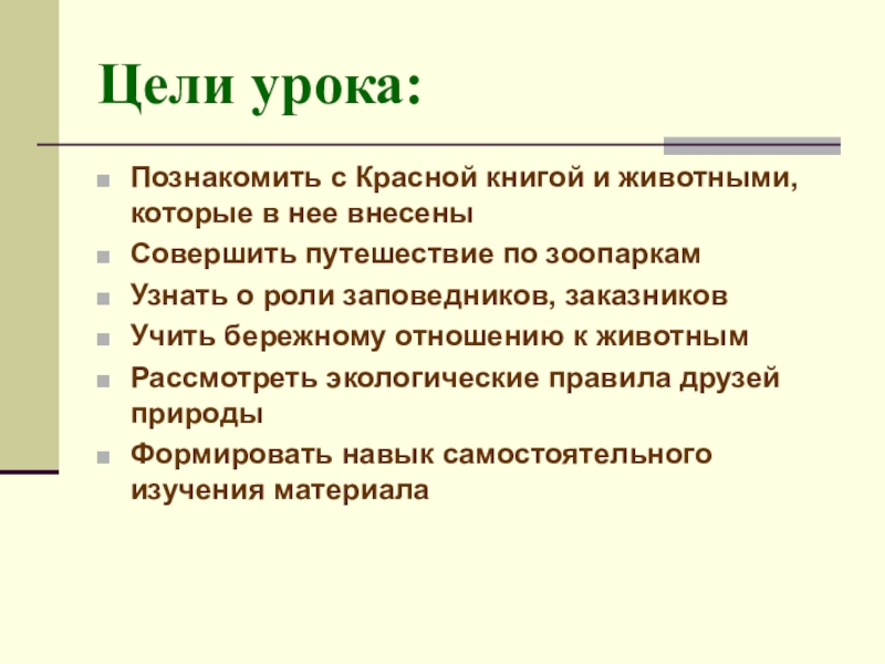 Цели урока:Познакомить с Красной книгой и животными, которые в нее внесеныСовершить путешествие по зоопаркамУзнать о роли заповедников, заказниковУчить бережному отношению к животнымРассмотреть экологические правила друзей природыФормировать навык самостоятельного изучения материала