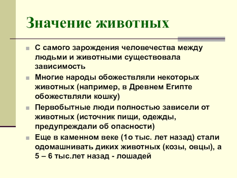 Значение животныхС самого зарождения человечества между людьми и животными существовала зависимостьМногие народы обожествляли некоторых животных (например, в