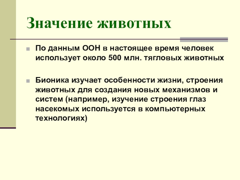 Значение животныхПо данным ООН в настоящее время человек использует около 500 млн. тягловых животныхБионика изучает особенности жизни,