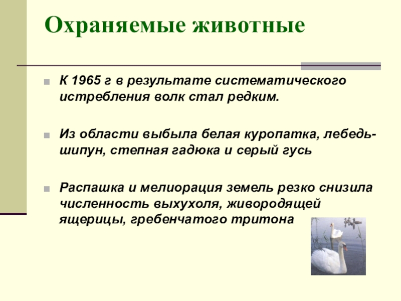 Охраняемые животные К 1965 г в результате систематического истребления волк стал редким.Из области выбыла белая куропатка, лебедь-шипун,