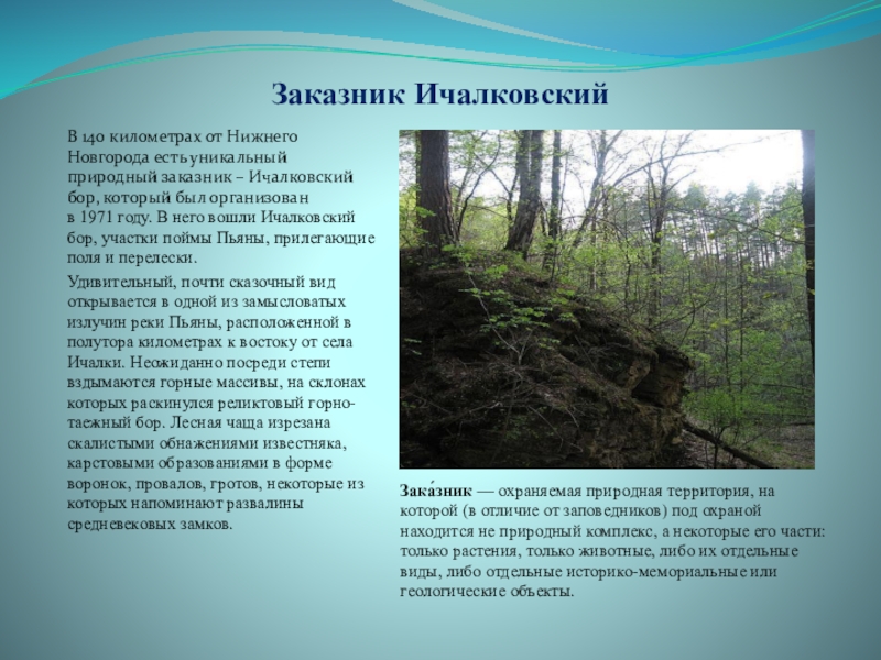 Зака́зник — охраняемая природная территория, на которой (в отличие от заповедников) под охраной находится не природный комплекс, а некоторые его части: только растения, только животные, либо их отдельные виды, либо отдельные историко-мемориальные или геологические объекты.