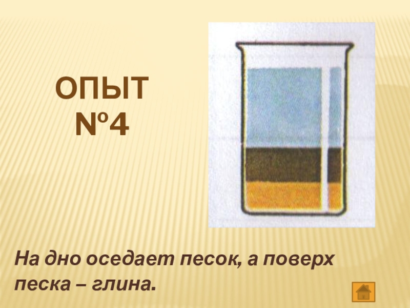 Опыт №4На дно оседает песок, а поверх песка – глина.
