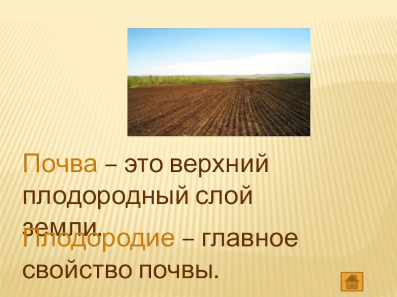 Почва – это верхний плодородный слой земли.Плодородие – главное свойство почвы.