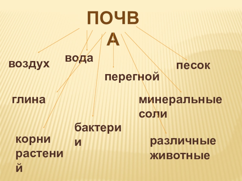 почвавоздухводапесокперегнойглинаминеральные соликорнирастенийбактерииразличные животные