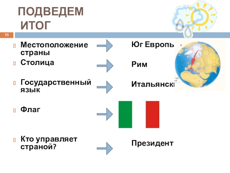 ПОДВЕДЕМ  ИТОГМестоположение страныСтолица     Государственный языкФлагКто управляет страной?  Юг Европы  Рим
