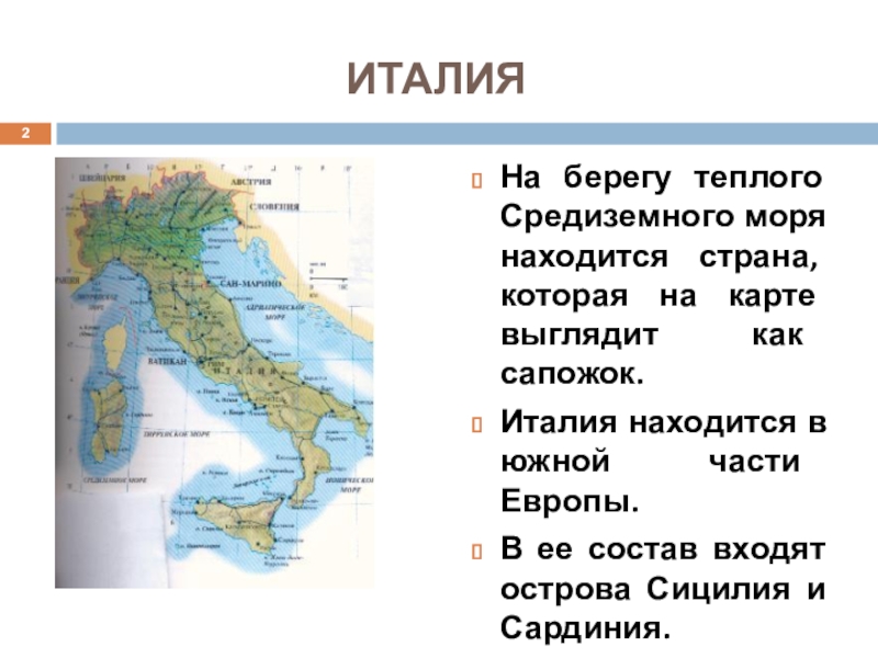 ИТАЛИЯНа берегу теплого Средиземного моря находится страна, которая на карте выглядит как сапожок. Италия находится в южной части Европы.В ее состав входят острова Сицилия и Сардиния.