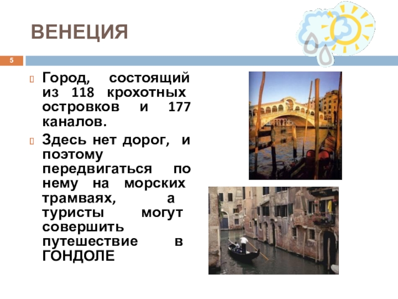 ВЕНЕЦИЯГород, состоящий из 118 крохотных островков и 177 каналов.Здесь нет дорог, и поэтому передвигаться по нему на