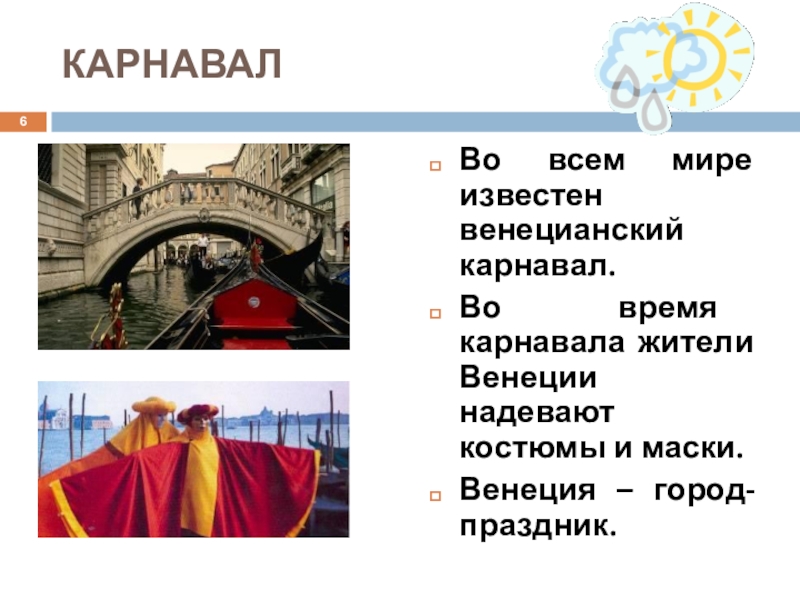 КАРНАВАЛВо всем мире известен венецианский карнавал.Во время карнавала жители Венеции надевают костюмы и маски.Венеция – город-праздник.