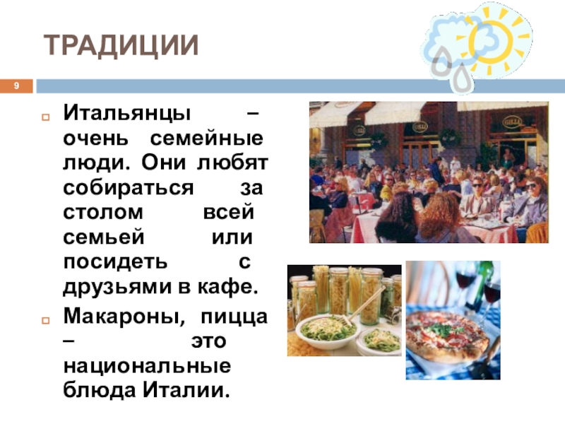 ТРАДИЦИИИтальянцы – очень семейные люди. Они любят собираться за столом всей семьей или посидеть с друзьями в