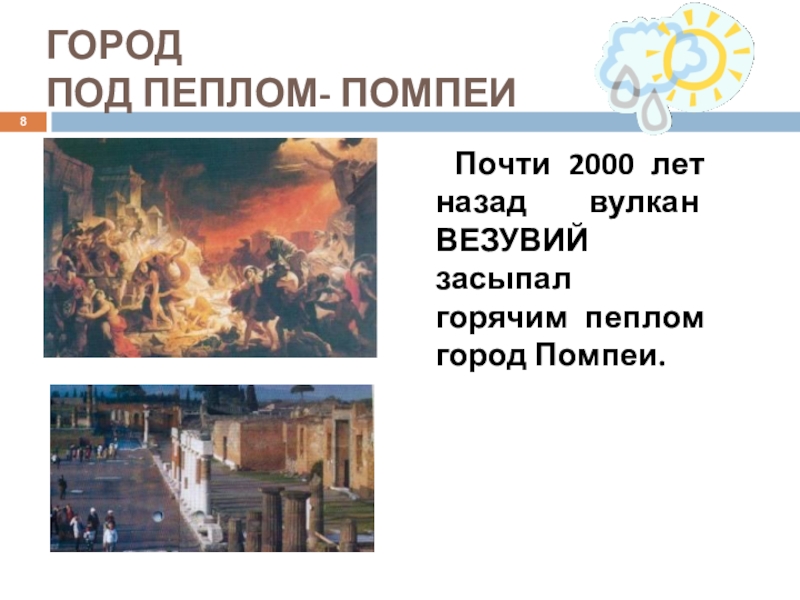 ГОРОД  ПОД ПЕПЛОМ- ПОМПЕИ  Почти 2000 лет назад вулкан ВЕЗУВИЙ засыпал горячим пеплом город Помпеи.