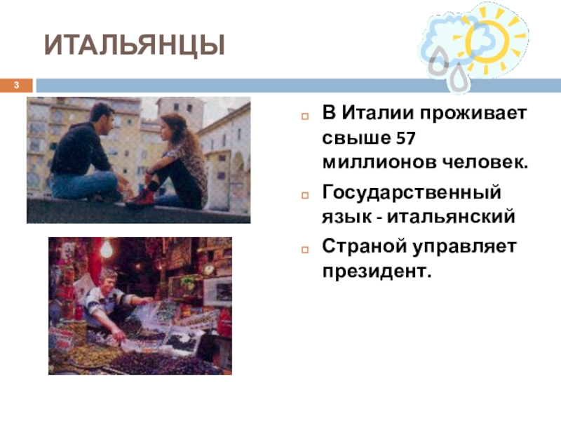 ИТАЛЬЯНЦЫ В Италии проживает свыше 57 миллионов человек.Государственный язык - итальянскийСтраной управляет президент.
